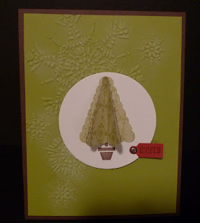 6. Punch three scallop triangles out of 2011-2013 Patterns Designer Series Paper Pack. Fold the trees in half and attach one side of each triangle together to form a 3-D tree. Adhere to circle.