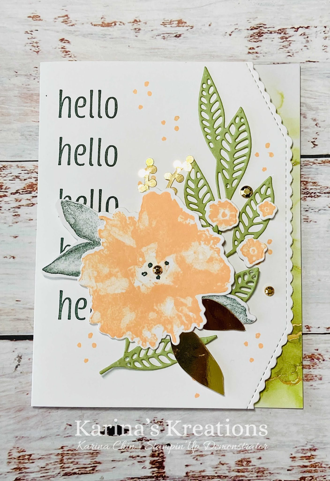 The flower is stamped with Pale Papaya ink and Evening Evergreen ink. The gold accents are from the Expressions ink Ink Ephemera pack.