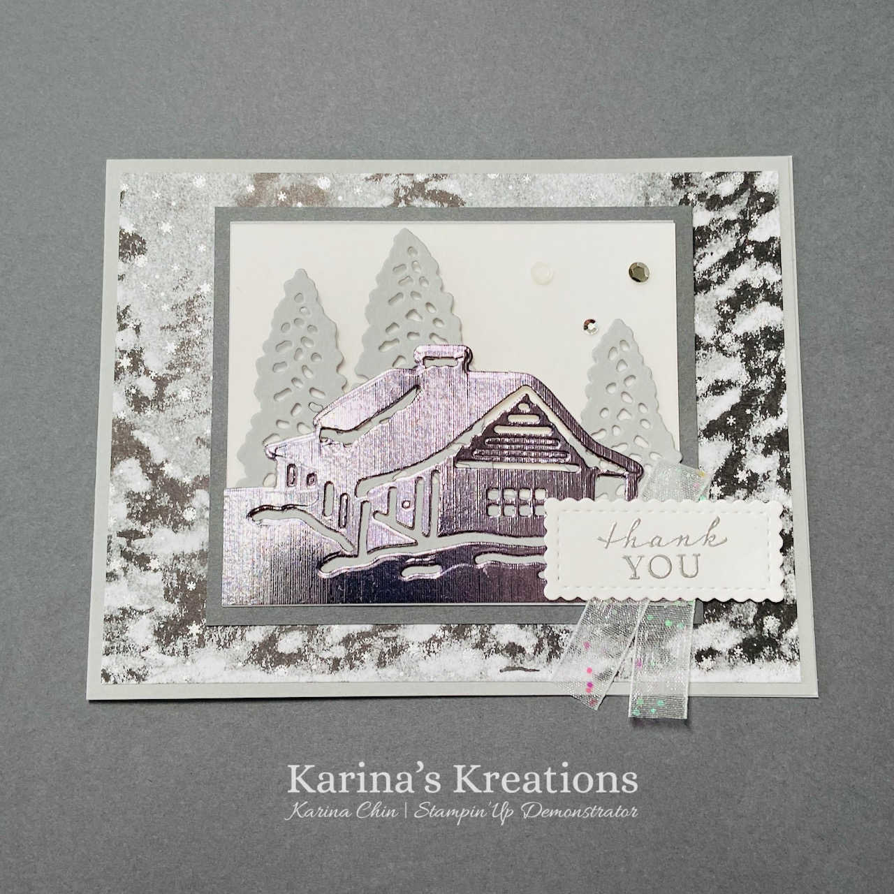The cabin was die cut from the new Silver Foil Specialty Paper and the background is the Peacful Place Specialty Designer Series Paper.
