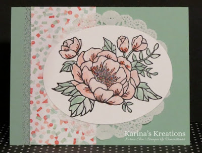 This beautiful card is colored with as blender pen and Blushing Bride, Watermelon Wonder and Mint Macaron ink pads. I added some Dazzling Diamonds to the centre of the card with a 2-way glue pen.