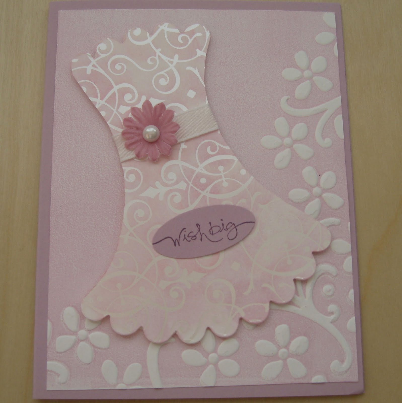 I created a dress template with a piece of card board, the Circle scallop die and the Big Shot die cut machine. Taking a pencil, I drew a rough image of a dress and cut it out making a dress template. I used the Circle Scallop die and Big Shot die cut machine with the Bride specialty paper to cut a scallop circle shape. Then I traced the dress design and cut it out. I used a sponge dauber to sponge Pretty in Pink and Pale Plum classic ink onto the specialty paper and wiped away the excess ink with a tissue. Some Whisper White Taffeta ribbon was added to the dress. I colored the flower from the Pretties kit with a sponge dauber and Pale Plum classic ink. The pearl from the pretties kit was attached to the flower with a glue dot.