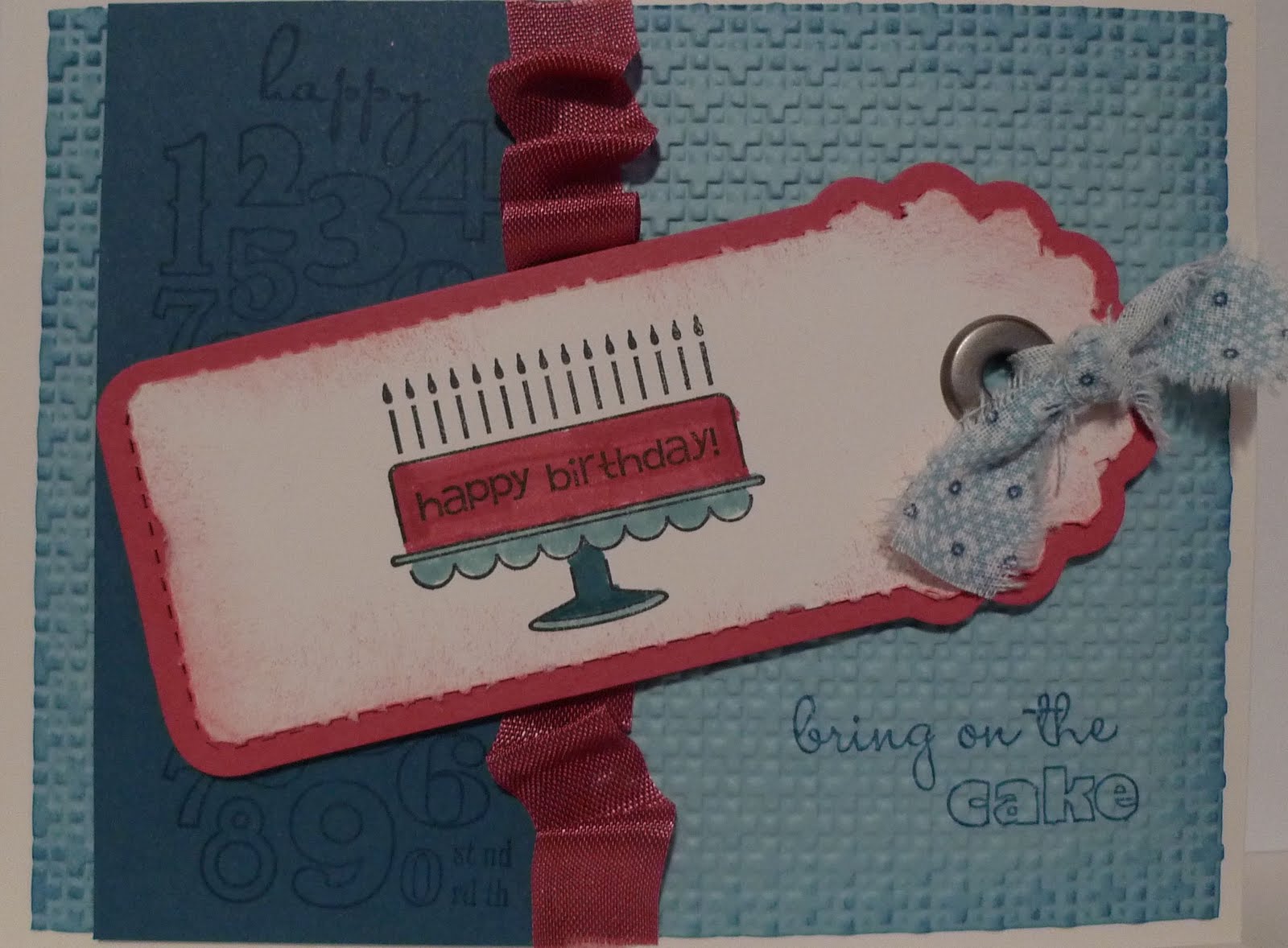 The new stamp set is called Bring On the Cake and has 13 birthday greetings. Yeah!!!!! I make tons of birthday card and was very excited to see this set.