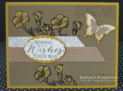 I love this card because it shows the bleach technique. The flowers were embossed with black embossing powder and colored with bleach. Soft Suede tuns a Delightful Dijon color when bleached. Isn’t this fun?