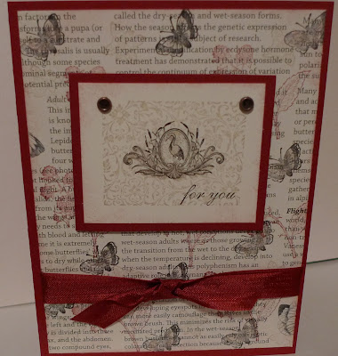 I was trying to use this beautiful color with a spring type stamp set. I chose Clearly For You out of the Occasions mini catalog because it has so many great images. I made my own designer paper by stamping on First Edition Specialty Designer Series Paper from the Occasions mini catalog. The little buttons are part of the Vintage Trinkets embellishments from the Idea Book & Catalog.
