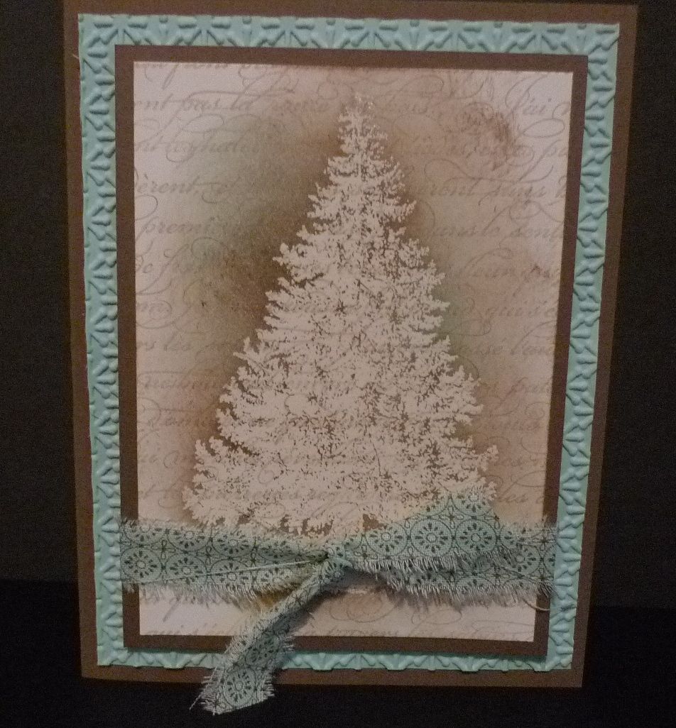 Stamp the tree image from Christmas Lodge in VersaMark ink on the Very Vanilla card stock. Sprinkle with Clear Stampin’ Emboss Powder and heat with a Heat Tool. Sponge Soft Suede & Pool Party ink over and around the tree image. Wipe excess ink away with a tissue. Mat onto Soft Suede card stock.