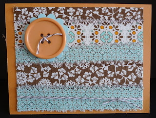 The first swap uses the beautiful Spice Cake Designer Series Fabric from the Holiday Mini Catalog. Each piece of fabric was stitched onto a piece of card stock and attached to More Mustard card base. So pretty!