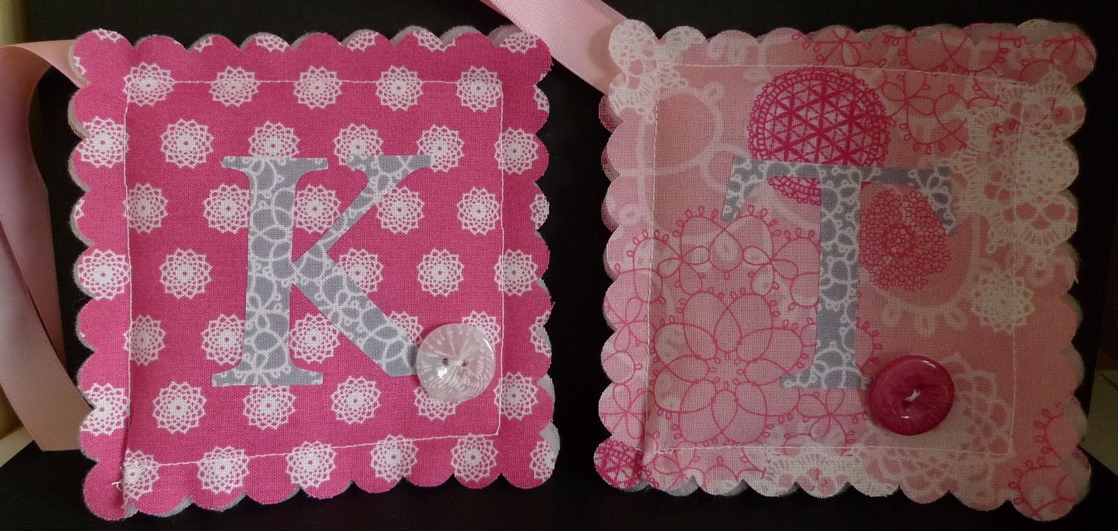 I made these for my roommate and some friends going to convention. I used the new Flirtatious Designer fabric and the Scallop Square Bigz Clear Die and Serf Essentials Alphabet.