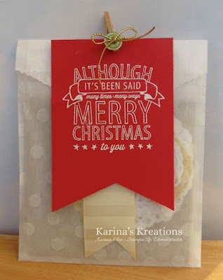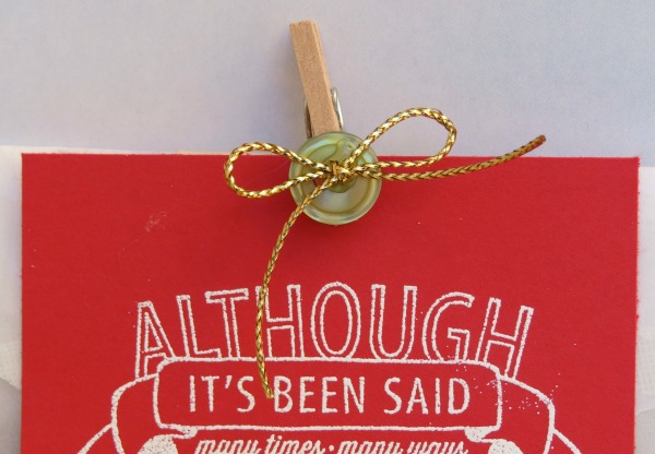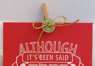 I used stamped an image from Cup of cheer with versamark ink on Real Red card stock and embossed it with Whisper White embossing powder. I added some Very Vanilla 1-1/4″ Stripes Satin Ribbon to a Glassine bag and attached it to the bag using a paper clip. I used a glue gun to glue a Brights designer button to the clothespin and the gold cording ribbon to the button.