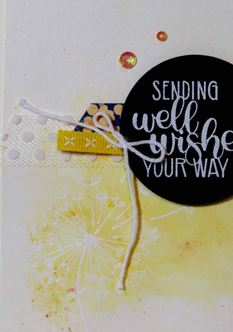 The dandelion was embossed on Shimmery White card stock with Whisper white embossing powder. Brusho was sprinkled on and activated with a spritz of water. I love the effect.
