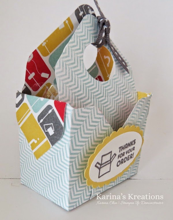 This cute little bag in a box is made with the envelope punch board and retiring I Am Me #130138 Designer Series Paper. I’m going to miss this paper.