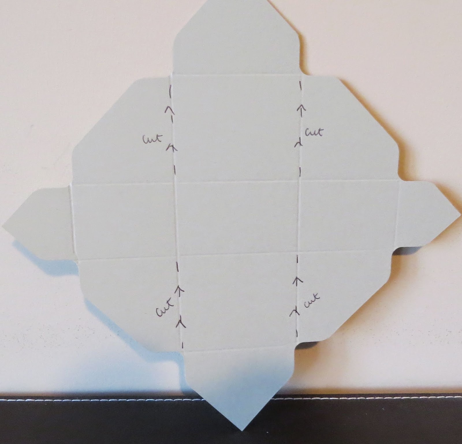 You will have two small triangles and two large triangles. With a large triangle facing you, cut up to the first score line on both sides.of the triangle. Repeat on the other side.