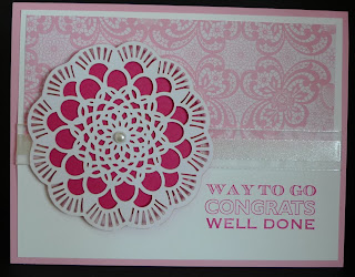 The Doily is from the Flirtatious Specialty Designer Paper Pack #122360 $ 15.95. The Dollies are Melon Mambo and Orange but the back side is white. Gail punched a Melon Mambo circle with the 2-1/2″ circle punch and layered it behind the Doily. Love it!!!!