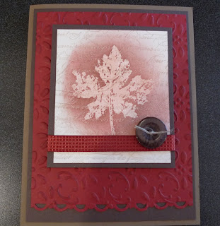 I had a class today and was demonstrating a Gently Falling Emboss Resist Card and my sponge ended up in Cherry Cobbler ink. The card is supposed to be Soft Suede with Pool Party ink. Now it’s Cherry Cobbler with Soft Suede and Early Espresso.