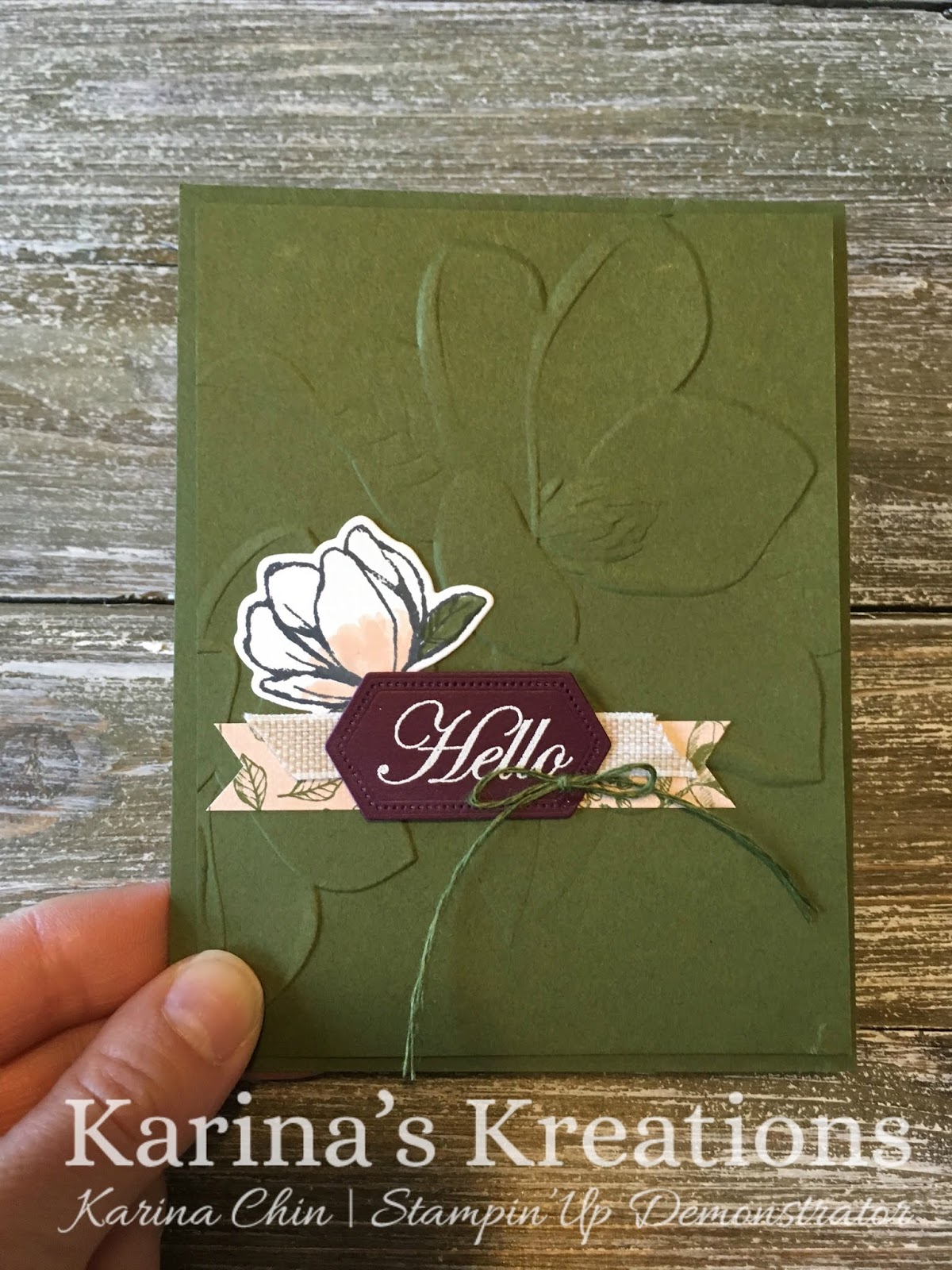 This suite comes with a brand new Magnolia Embossing Folder. This embossing Folder is thinner than the old 3-D folders so you will have to use a shim or I just purchased a 3D Embossing Folder plate for $13.50 #149658.