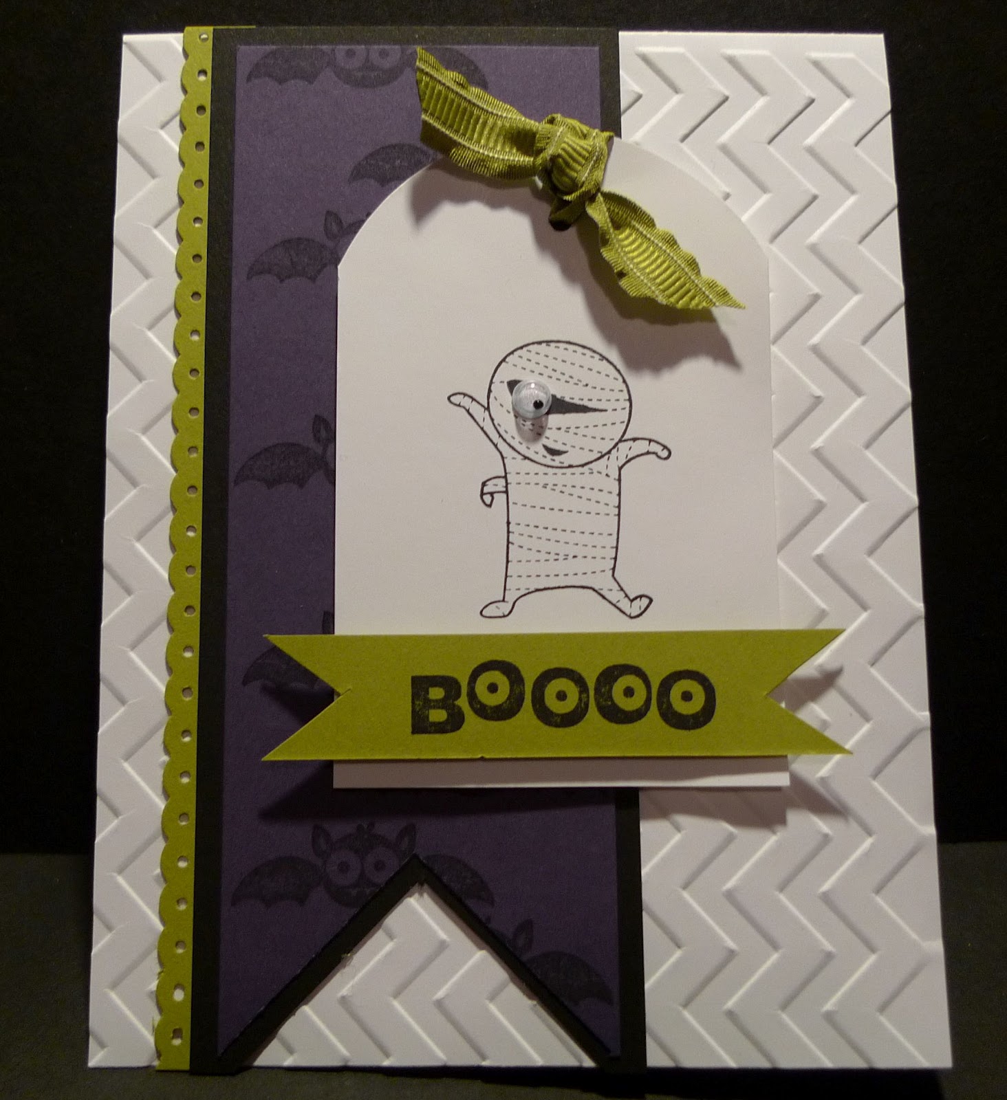 Bats were randomly stamped on the Elegant Eggplant layer. I added some Lucky Limeade card stock that was punched with Dotted Scallop Ribbon Border Punch #119275 $20.95.