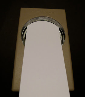 I stamped the mummy on Whisper White card stock with Stazon ink. I fed the top part of the card stock into the 2-1/2″ circle punch #120906 $22.95 to get the nice round top.