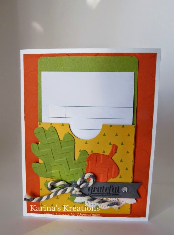 3) Fold up a pocket from the Gratitude for Days Simply Created Kit and attach o the card base with Sticky Strip.
