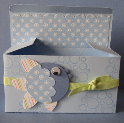 This is a cute box we made at my kids punch class. The box is really easy to make because it uses the Box # 2 die and the Big Shot die cut machine. It cuts and scores the box for you. I got the punch fish idea from convention. We filled the box with Salt Water Taffy.