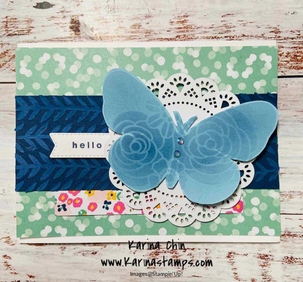 I’m sharing a card we made at My Butterflies & Flowers Decorative Mask card class. I wanted to show the beauty and ease of using the decorative masks with card stock, ink and blending brushes to create a variety of projects, The Butterflies & Flowers Decorative Masks come in a set of 6 for only $13.50. They are plastic and can be used many times. I used the Hello Beautiful stamp set for most of the sentiments on my projects.