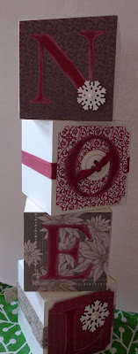 I had a home decor class the other day and my friend Sue used the Deck The Halls Designer Series Paper on Stampin’Up’s Decor Blocks. The blocks are item number 116829 and can be found in the Definitely Decorative catalog on p. 9.
