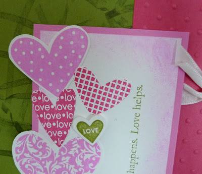 The hearts are from the I Heart Hearts stamp set which coordinates with Heart to Heart and small heart punch. The small heart punch is new and is in our Occasions mini catalog. The hearts were stamped in Pixie Pink, Old Olive and Melon Mambo ink and attached to the card.