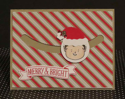 The elf was stamped with black archival ink and punched out with a circle punch. The elf was attached to two pennies separated by a stampin dimensional. This allows the elf head to spin.