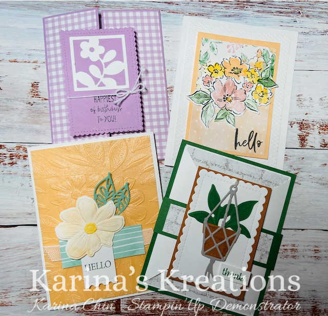 The cards are varied but we always have at least 1 fancy fold card. I try to design the cards so you can use whatever sentiment stamp set you have on hand.