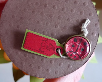 The Box is made with the left over piece of roll from a package of Mini Glue Dots. She painted it an Apricot Appeal color and the matching card stock was stamped and wrapped around the roll. The roll was attached to the scallop circle using Tombo Mono Multi Glue.