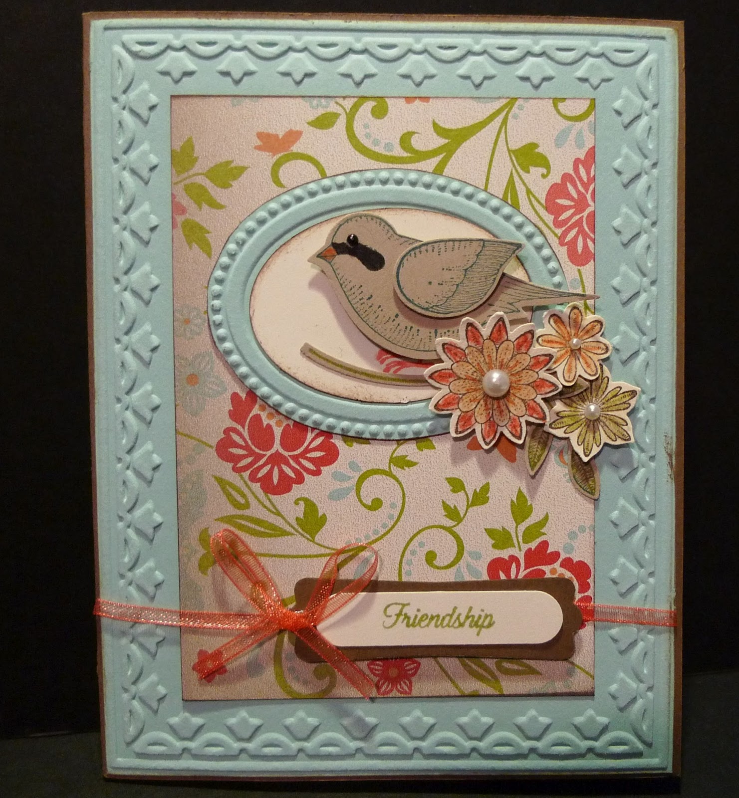 I got this beautiful card from a swap I was in. There was no name on the card so I don’t know made it but I thought it was a perfect example of a beautiful card that uses multiple Sale-a-bration products. This card uses the Language of Friendship Stamp set that you can get for FREE with a $60.00 order. It coordinates with the Bird Builder Punch #117191 $22.95 which is amazing because you don’t have to cut out the bird pieces!!! Stamp you image, punch it out and you’re done!!!!