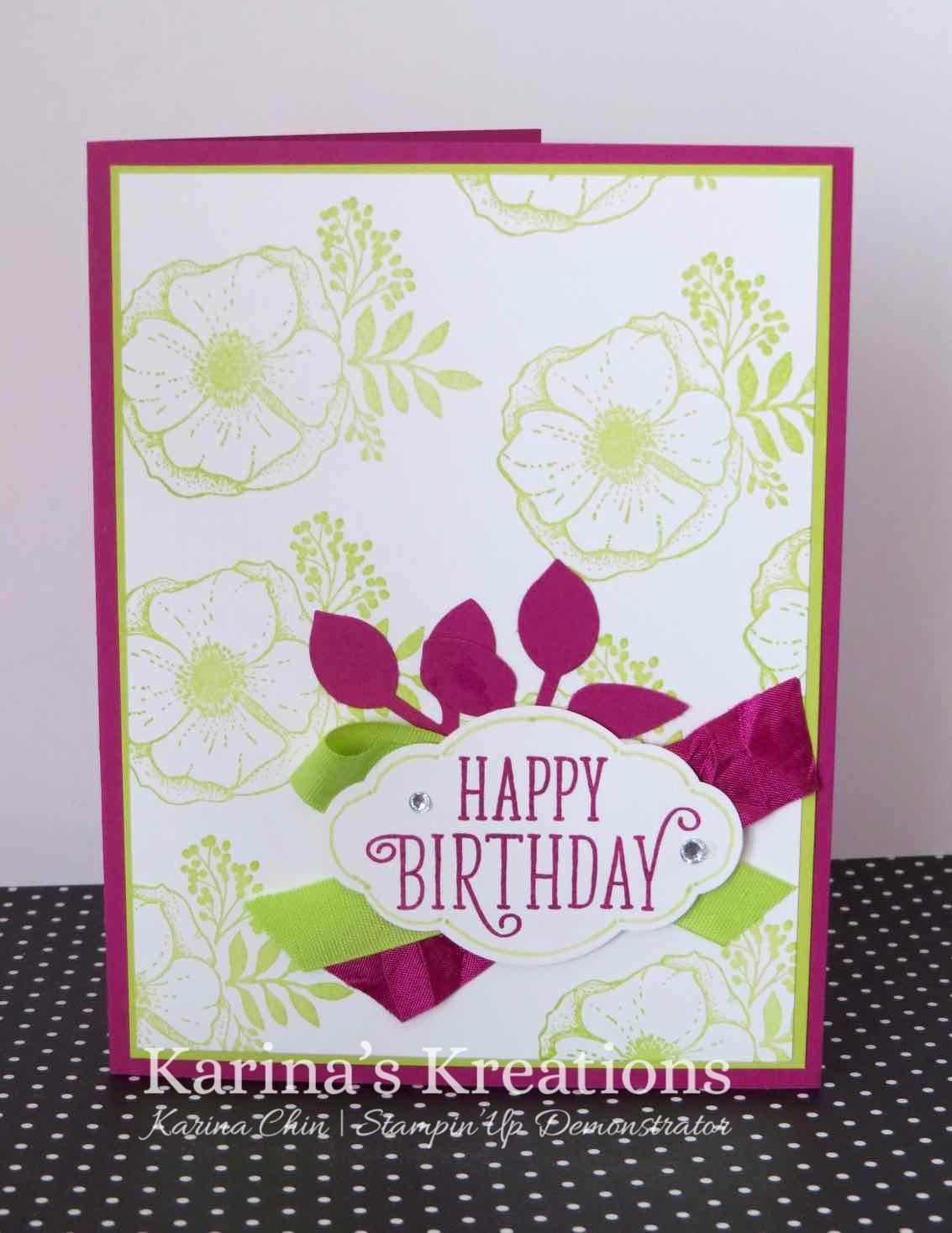The sentiment is from the Happy Birthday Gorgeous stamp set which I punched out using the Pretty Label punch. I doodled around the edge with a Lemon Lime Stampin’ Write marker.