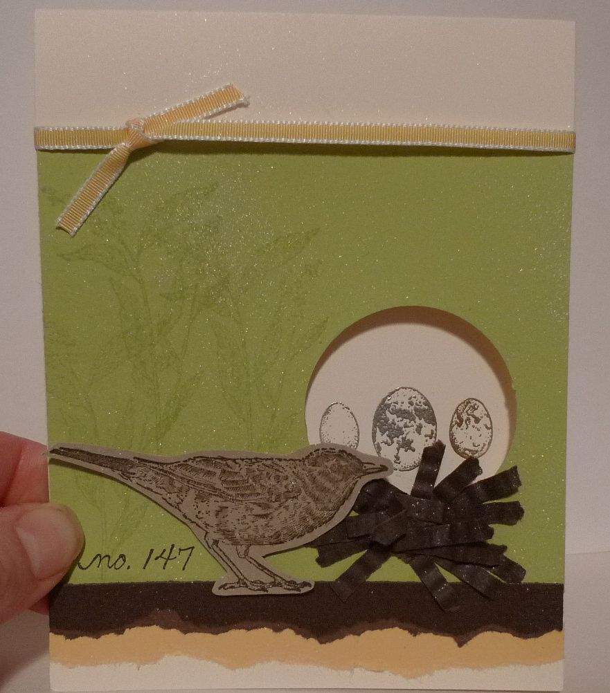 The nest was made with a paper crimper and run through my paper shredder. I used sticky tape to create the layers of the nest.