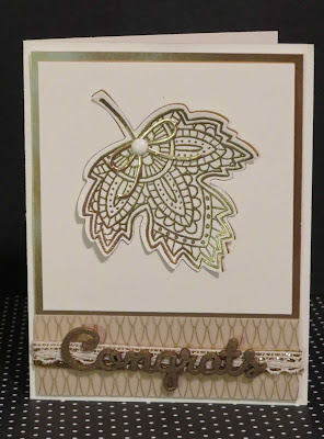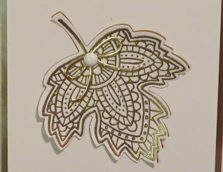 The leaf image and greeting is embossed with Gold Embossing Powder. Lorna used a Gold Foil sheet and Winter Wonderland Designer Vellum on this card.