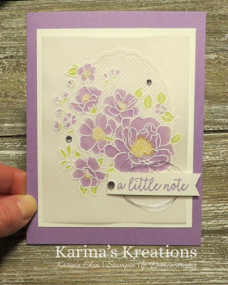 I stamped the image with Versamanrk ink on Vellum card stock and embossed the image with Whisper White embossing powder.