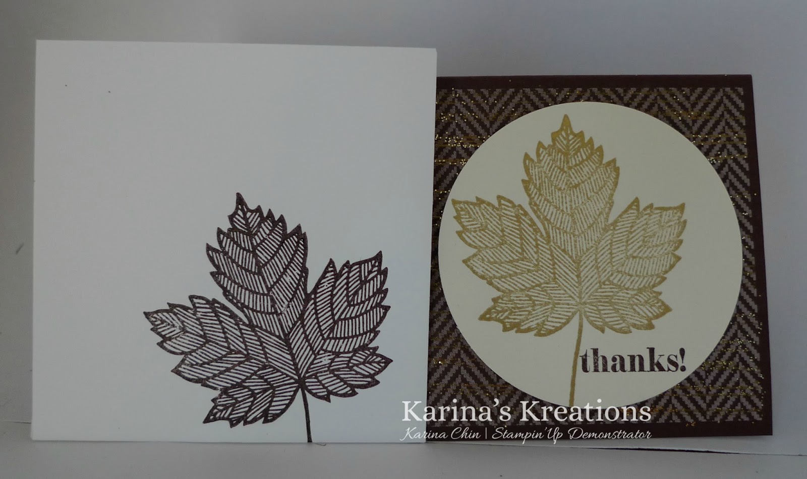 The maple leaf was stamped with the Gold Metallic Encore ink Pad and punched out with the 2-1/2″Circle Punch.