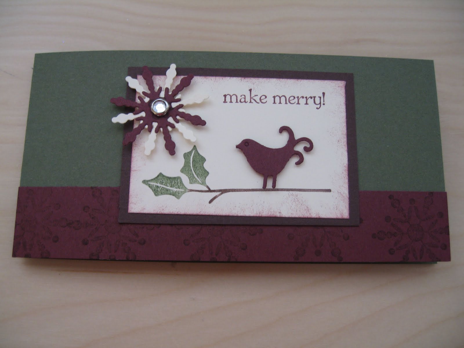I used Always Artichoke card stock as a card base(6″x12″) and layered on Bravo Burgundy card stock that was stamped with the snowflake image from Berry Christmas with Bravo Burgundy ink. I colored the branch with a Chocolate Chip and Always Artichoke Stampin’ Write marker and stamped on Whisper White card stock. The bird and snowflake images were made with the Stampin’Up Sizzlets Merry Details die and Big Shot die cut machine. I added a clear Rhinestone brad to the center of the snowflake.