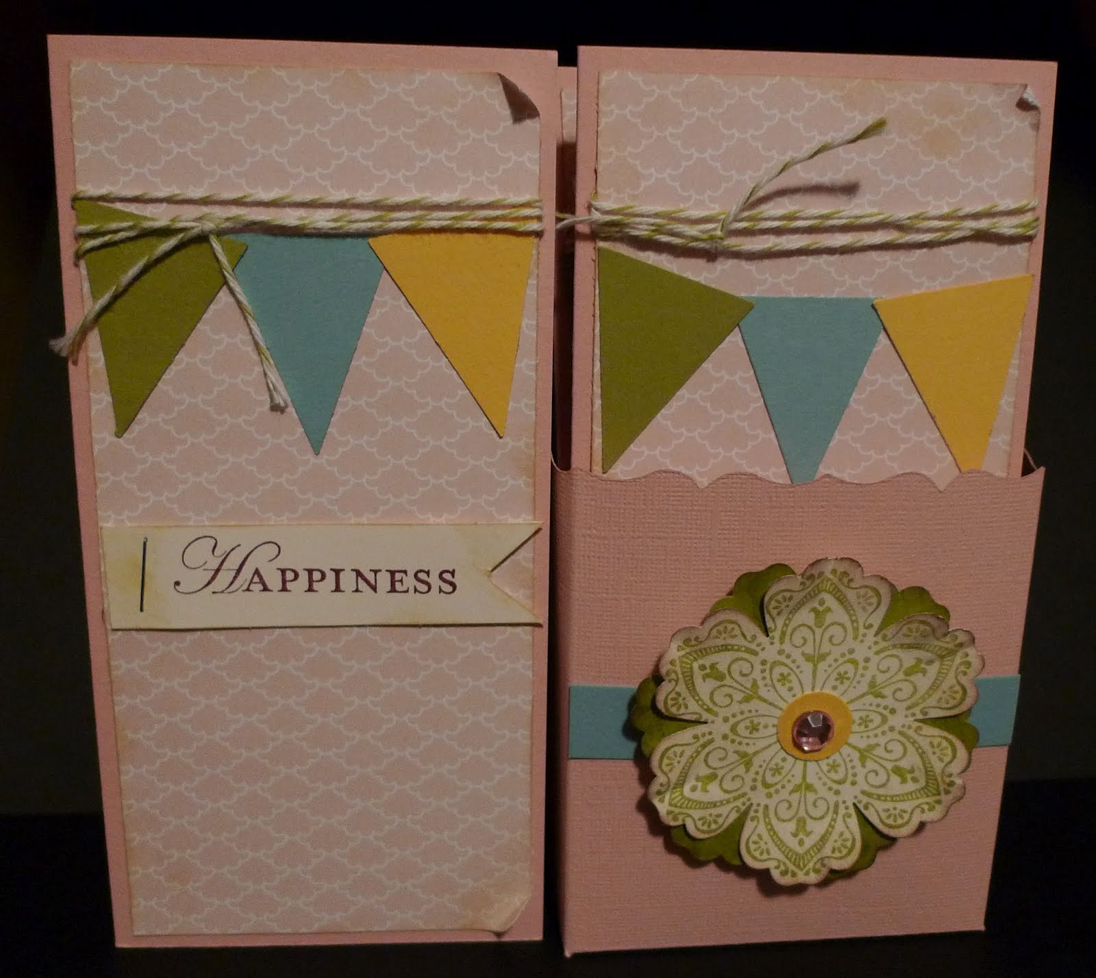 The Blushing Bride card bases are 6″ x 6″ scored at 3″. Twitterpated Designer Series Paper 5-3/4″ x 2-3/4″ decorates the card. The Petite Pennants Builder punch makes the pennants on the cards.