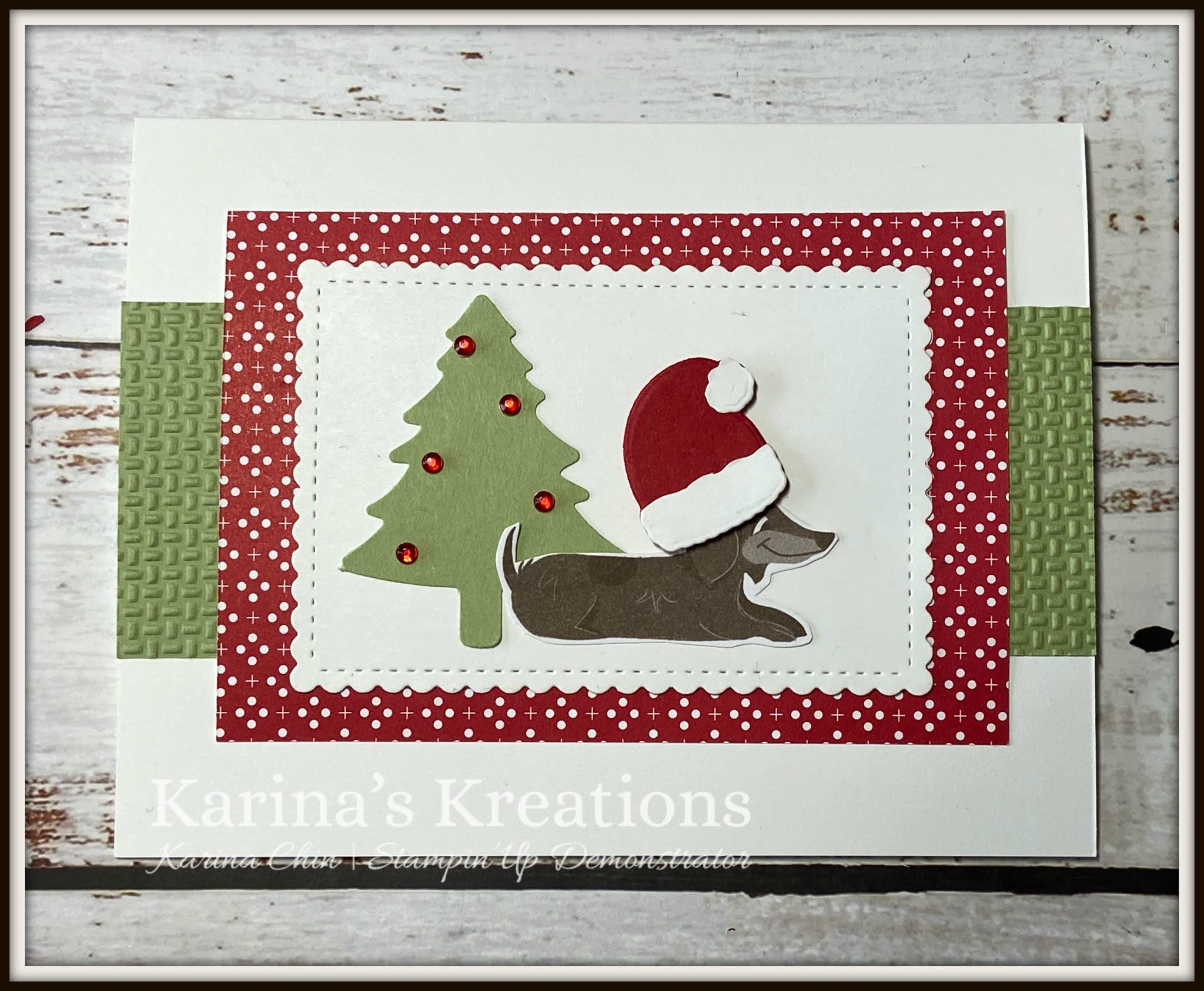 I used the Santa hat die on my dog to make this super cute card. The dog was cut out of the Playful Pets designer series paper. Designer Series Paper is on sale for 15% off until Oct 31st.Click this link to place an online order. The October Hostess code is #RARQJRD7.