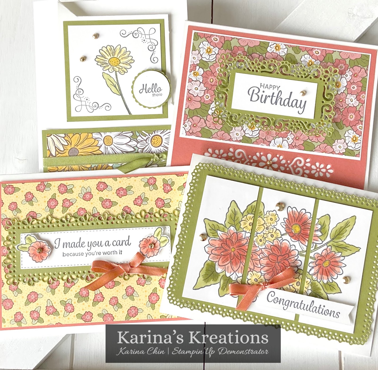 You will need Daffodil Delight, Calypso Coral, Old Olive and a Light Crumb Cake Stampin’ Blends, a black memento ink, adhesive and the Here’s a Card Stamp set to complete the cards as shown.