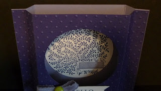 This card is called a shadow box card. You need 2 pieces of 4-1/4″ x 5-1/2″ card stock scored at 1/2″, 1″, 4-1/2″”, 5″. I used Concord Crush and Wisteria Wonder card stock.