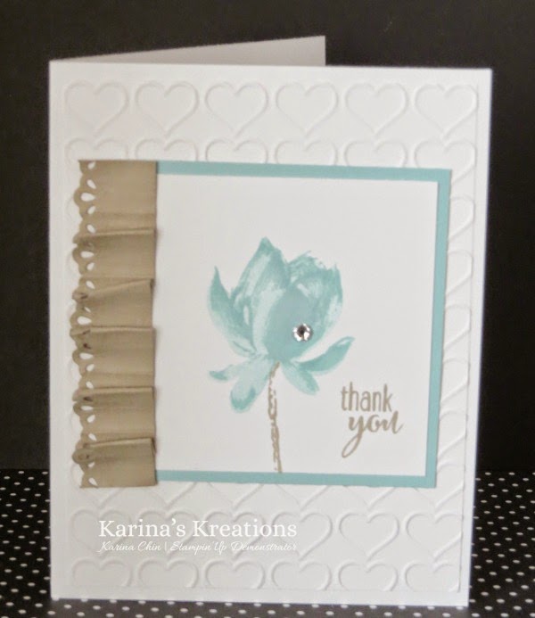 The lotus blossom stamp set is very special. It’s a three step stamp. I used pool party ink to create the flower. The flower pieces are numbered so you know with flower image to stamp first. The last image should be stamped off on scrap paper to get a lighter shade of Pool Party ink.