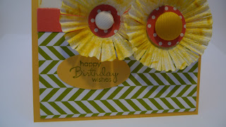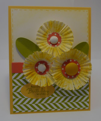 You get a whole bunch of white flowers that look like cup cake liners. I choose two different sizes and snipped in between the petals and sponged them with Daffodil Delight ink. I used the 1″ circle Punch #119868 and 3/4″ circle Punch #119873 and punched circles from Tea for Two Designer Series Paper. The circles were attached to the center of the flowers with brads that come in the kit.