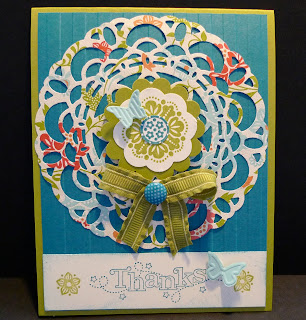 What do you think of this card? I finally used my Paper Doily Large Sizzlets Die #125592 $26.95. The trick is to use Designer Series Paper and wrap it around a pencil. The cut pieces pop out. It’s very easy!!! I used the Everyday Enchantment Sale-a-bration Designer Series Paper that I got for Free.