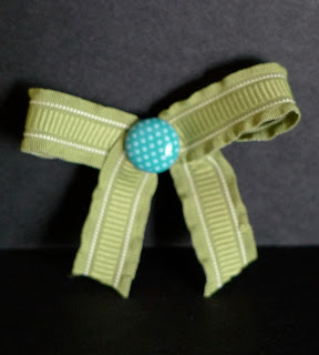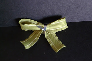 I also wanted to show you a cheater bow today. You can create a perfect bow by wrapping a brad around some ribbon. I used Lucky Limeade 3/8″ Ruffled Ribbon #122977 $13.50 and Designer Printed Brads #122940 $9.95.