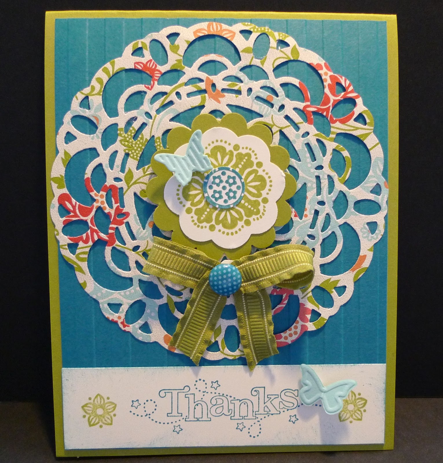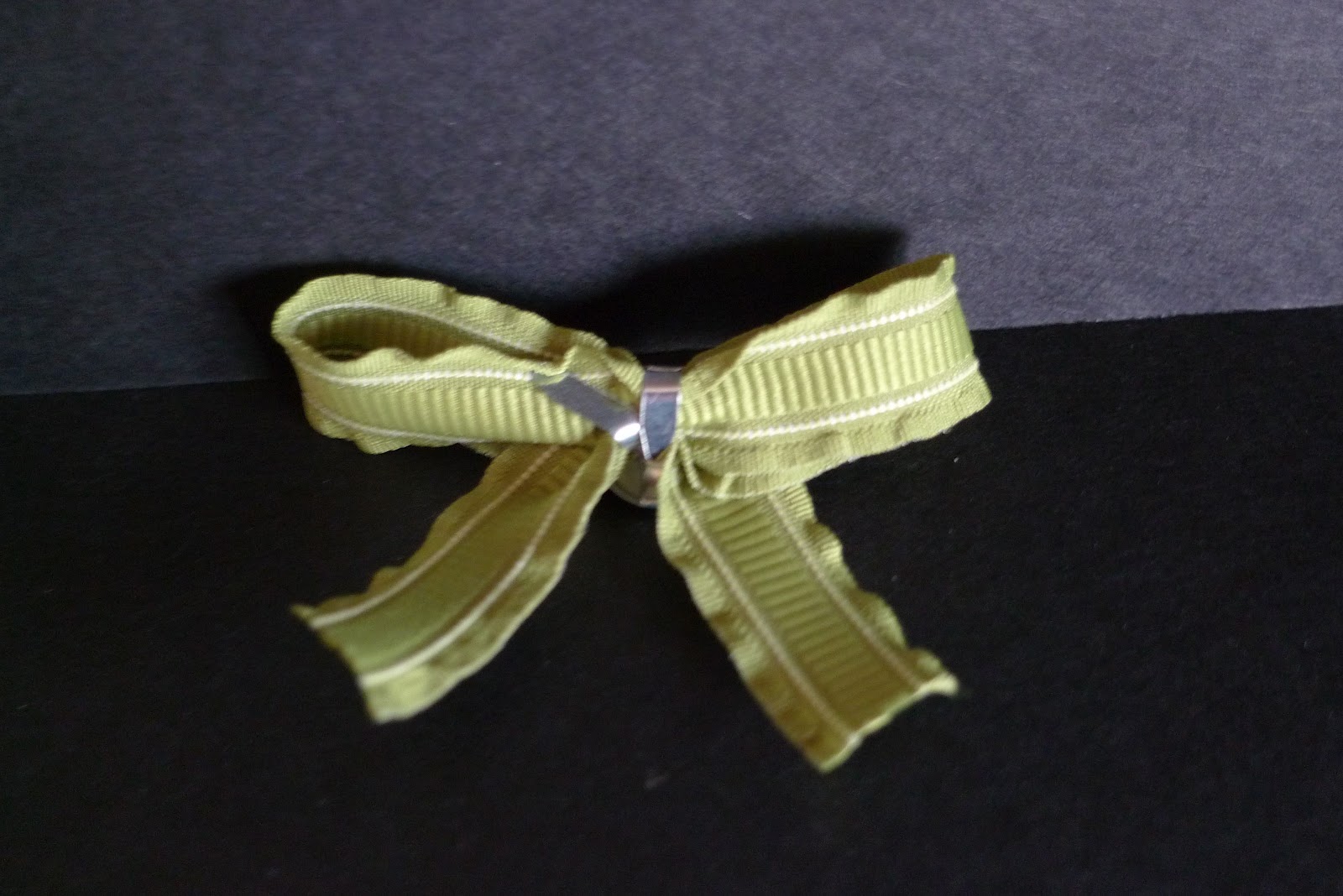 I also wanted to show you a cheater bow today. You can create a perfect bow by wrapping a brad around some ribbon. I used Lucky Limeade 3/8″ Ruffled Ribbon #122977 $13.50 and Designer Printed Brads #122940 $9.95.