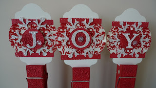I wanted to share with you my Secret Santa gift. I found these cute clothespins at the dollar store and turned them into a holder for my Christmas banner.