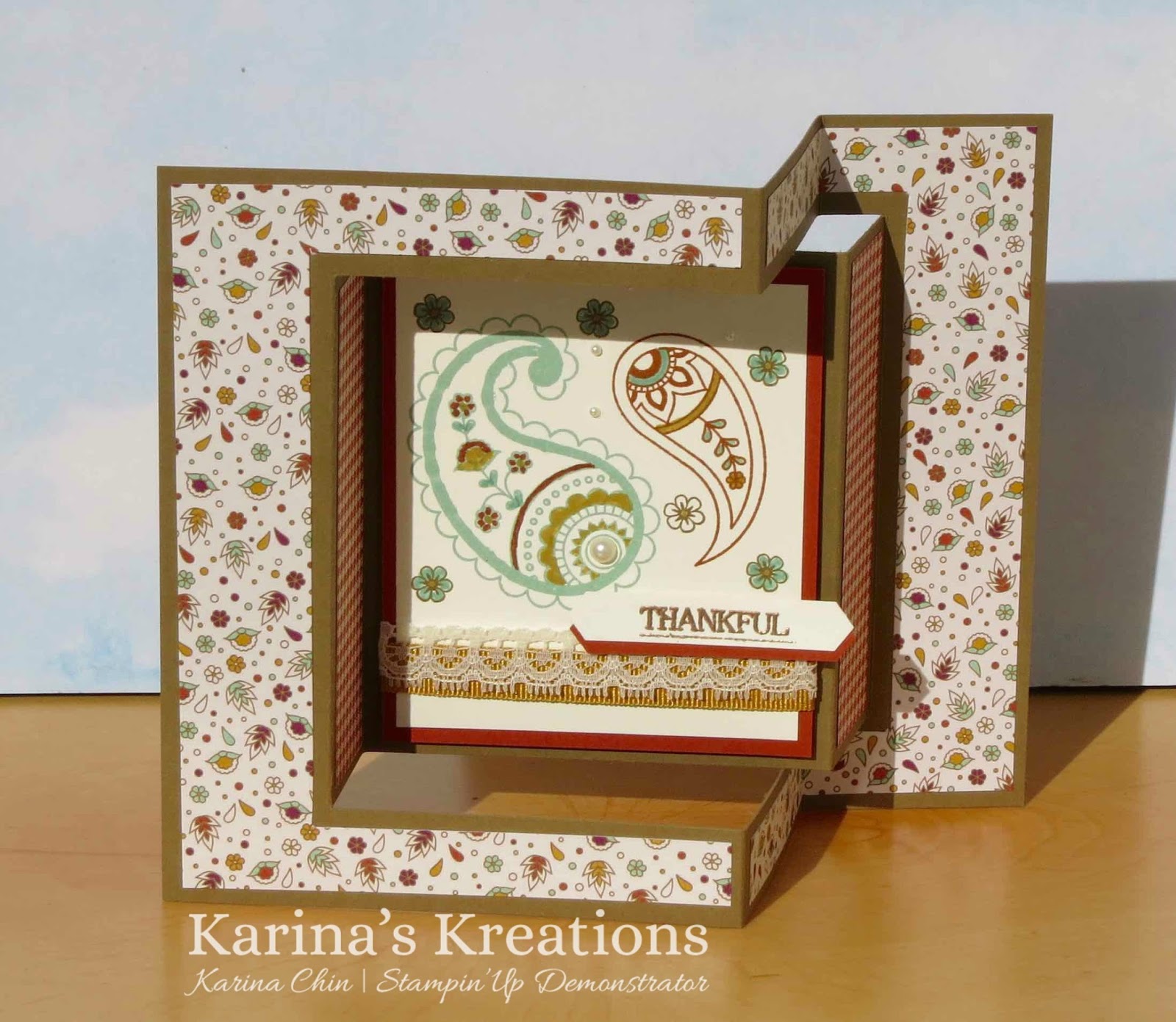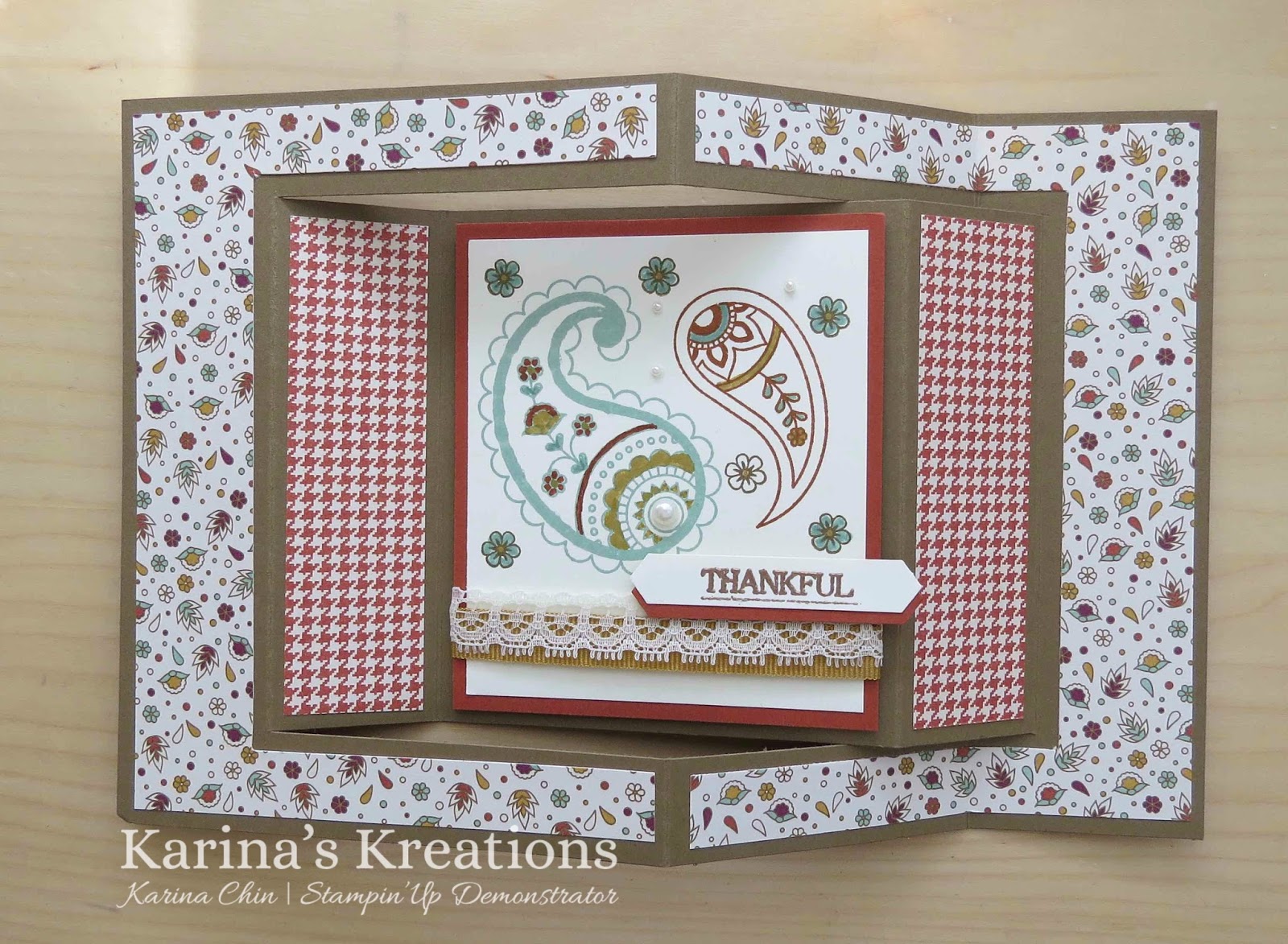 I chose to make a thankful fancy fold card using the Petals and Posies stamp set and coordinating Petals and Paisleys Specialty Designer Series Paper. This paper is so gorgeous you don’t need to add much to make a beautiful card.