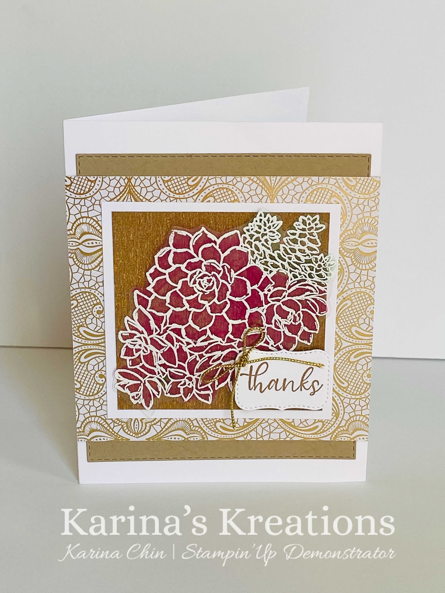 The back of the window sheet was colored with Dark Magenta Madness and Dark Just Jade Stampin’ Blends. The window sheet was attached over Stampin’Up Gold & Rose Gold Metallic Specialty Paper.