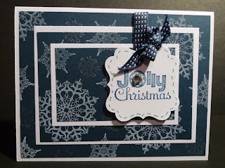 Barb also made this beautiful card using the triple time stamping technique. The trick is to stack all the Night of Navy card stock pieces on top of each other & centered and then stamp with the Snowflake Soiree stamp set #127922 with Whisper White Craft Ink #101731. Then mat the Night of Navy card stock on Whisper White Card stock.