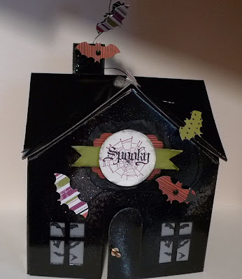 It’s very easy to make!!! It’s called Design -a-House from the holiday mini catalog. I spray painted it black and used the Wicked Cool stamp set and Wicked Fun Specialty Designer Series paper to decorate it. The bats are made with the super cute Bitty Bat punch.