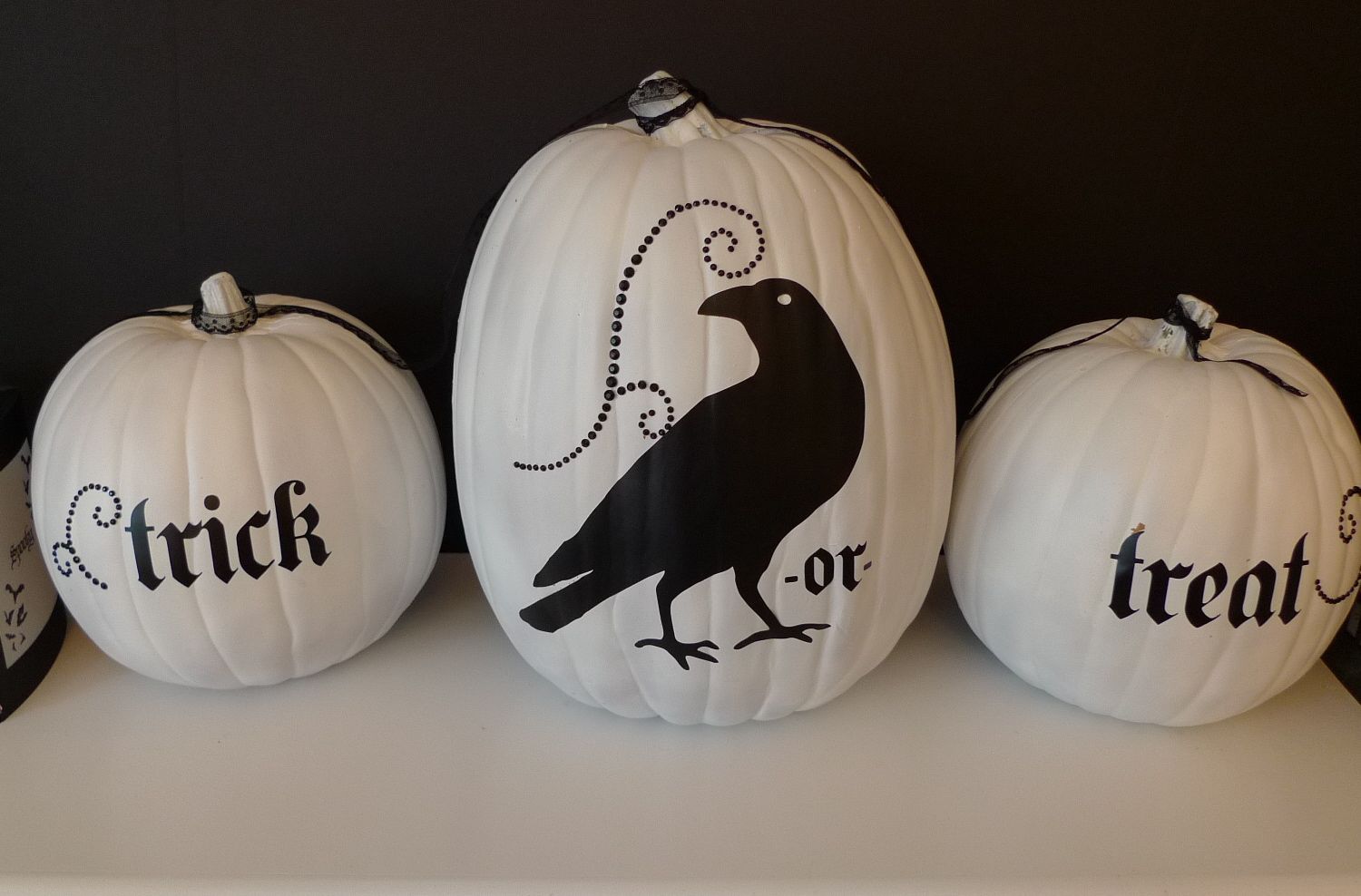 I spray painted my craft pumpkins white and added the decor element. Black Flourish Designer jewels were added as an accent. Raven 1/2″ Lace Trim ties all the pumpkins together.